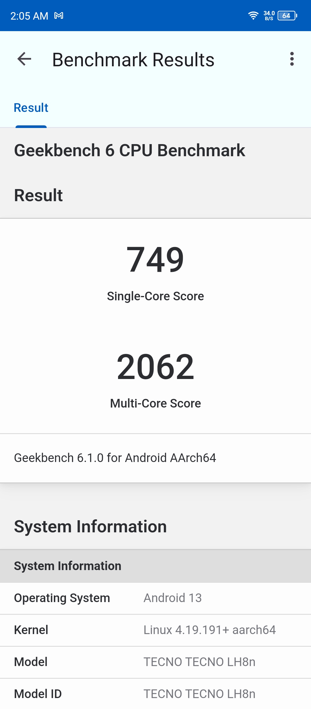 The device achieves respectable performance benchmarks, with an Antutu score of 406,084 and Geekbench 6 scores of 749 for single-core and 2,062 for multi-core.